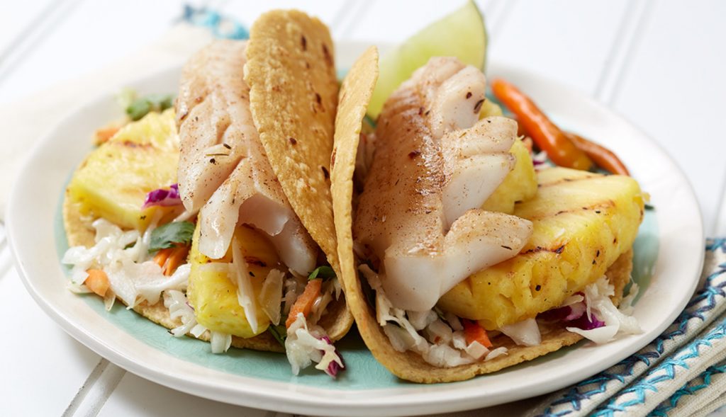 Pentru servire, așează frunzele de spanac pe bucățile de tortilla, apoi o bucată de ananas și o bucată de file de Alaska Pollock. Stoarce, la final, sucul unei felii de lamâie pe bucata de pește.
