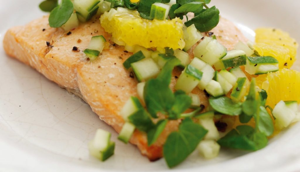 Între timp, amestecă într-un bol de dimensiuni medii măcrișul tăiat, castraveții și bucățile de portocală. Adaugă câteva picături de oțet de vin alb, ulei de măsline, sare și piper după gust. Pentru servire, adaugă în farfurie salata, peste bucățile de somon.