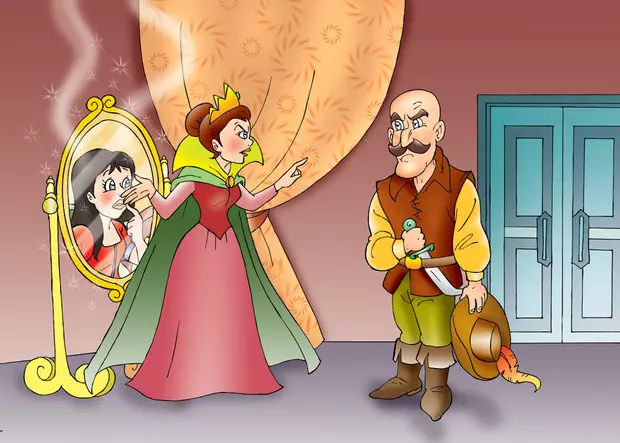 Împărăteasa se sperie din cale-afară, fiindcă ştia prea bine că oglinda nu minte. Şi-şi dădu pe dată seama că vânătorul o înşelase şi că Albă-ca-Zăpada era încă în viaţă.