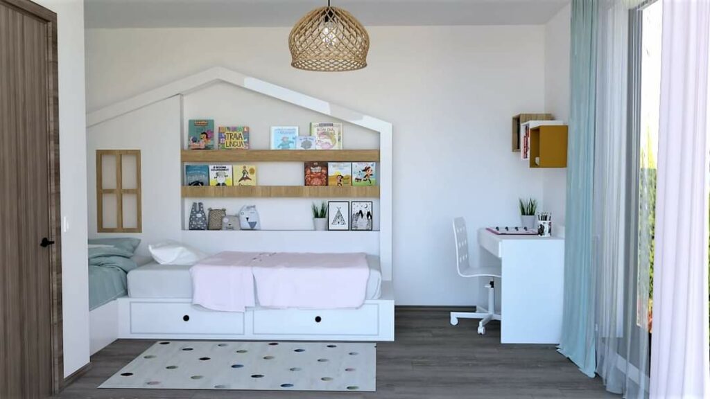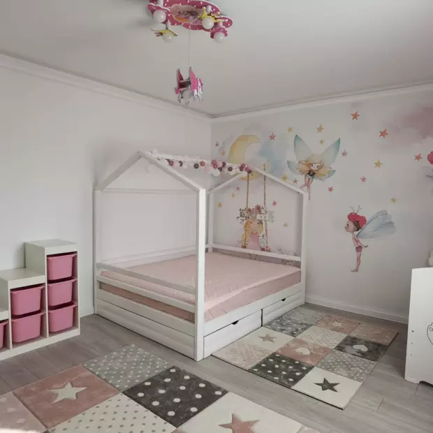 Încăperea copilului în care este integrat un pat Montessori din lemn masiv jos poate fi soluţia ideală în tranziția de la pătuţul de bebeluşi la cel de preadolescent. O astfel de variantă vine cu estetică distinsă, funcţionalitate ridicată, datorită sertarelor accesibile și ajută la crearea unui mediu perfect echilibrat. O comodă cu rafturi deschise, o măsuţă cu scaune joase şi un covor pufos sunt elementele care întregesc o amenajare ideală pentru micuţii preşcolari. Aceste detalii vor satisface necesarul de mişcare şi vor provoca senzorial micuţii. Culorile pastel, roz, bleu și cele neutre – gri, bej – combinate cu alb vor ajuta la crearea unei încăperi echilibrate pentru o micuţă domnişoară.