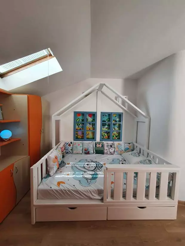 Mansarda poate pune provocări când vine vorba de compartimentare şi organizare, însă această zonă poate deveni locul de somn, joacă şi odihnă al copilului. Datorită formelor atipice mansarda necesita montarea de mobilier realizat la comandă. Paturile Montessori sunt ideală în astfel de amenajări şi nu doar din pricina funcţionalităţii ridicate, dar şi a esteticii deosebite. Patul cu gărduleţ de protecţie poate deveni, pe lângă spaţiu de odihnă şi scena de joacă pentru micuţi. Astfel de corpuri sunt, de obicei, prevăzute şi cu lăzi pentru depozitare funcțioale, însă pot fi completate de rafturi deschise cu aspect de geam, ce vor ajuta la dezvoltarea imaginaţiei copiilor. Într-o astfel de încăpere pot fi montate și rafturi deschise completate de mese de joacă, în cazul în care micuţul frecventează grădiniţa sau un birou, dacă rezidentul este elev de şcoală.