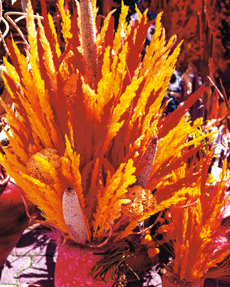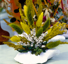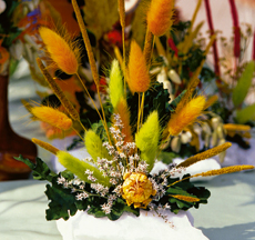 Cu adeziv, monteaza de suport un burete, in care fixezi apoi plantele uscate si infigi cateva tulpinite de graminee (orz, ovaz, grau, briza, obsiga, coada-iepurelui), care au fost vopsite (cu sprayuri acrilice) intr-o singura culoare, dar in doua nuante diferite.
