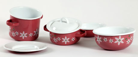 BEBE set de vase emailate contine vase miniaturale de gatit si servit, potrivite ca marime pentru portia zilnica de mancare a celui mic: o oala cu capac, o craticioara cu capac, un castronas, un bol si o farfurioara intinsa.