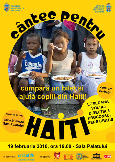 Suma incasata din vanzarea biletelor va fi donata UNICEF Romania pentru a salva vietile copiilor din Haiti si pentru a le acorda ingrijiri de urgenta, hrana, adapost si protectie.