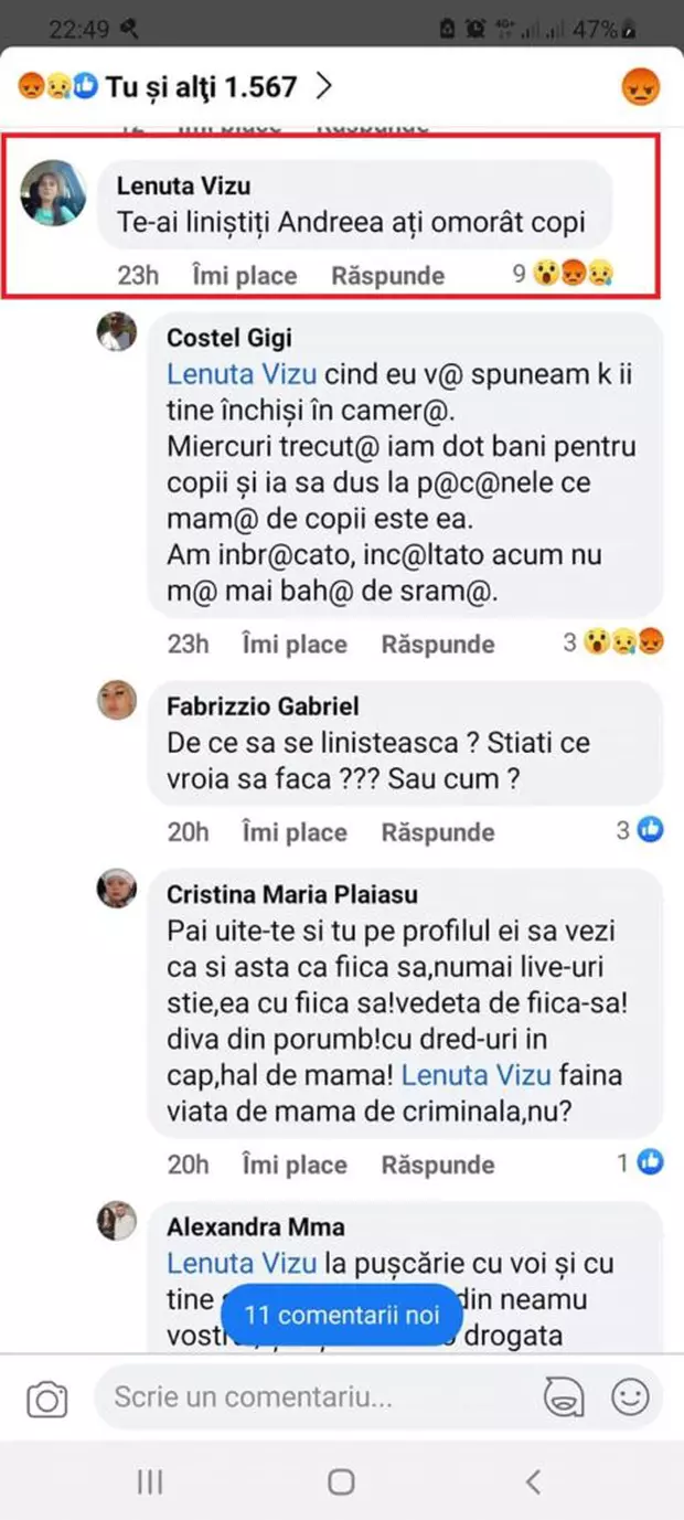 Bunica gemnilor, mama Andreei, a postat și ea în mediul online următorul mesaj: „Te-ai liniștit, Andreea, ai omorât copiii.'