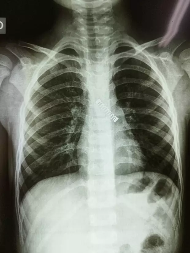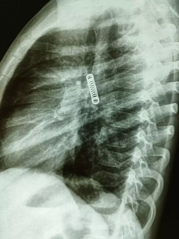 În timp ce efectuau verificări ample pentru a detecta problema, medicii au fost uimiți să găsească un obiect metalic, mai exact arcul unui pix, în plămânul stâng al copilului. Obiectul a fost vizibil pe radiografie.