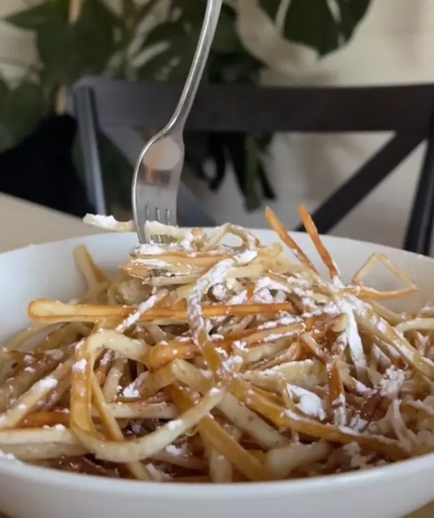 Aluatul preparatului nu diferă cu nimic față de cel al clătitelor clasice. Singura diferență este forma dată compoziției. În loc să se prăjească foi tradiționale de clătite, femeia care a făcut postarea pe TikTok a ales să toarne fâșii subțiri de compoziție în tigaie, de forma unor spaghete.