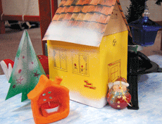 O casuta (sau mai multe) si braduti in miniatura, care vor fi pictate cu carioci si date apoi cu sprayul cu zapada artificiala, sunt elementele de baza ale peisajului.