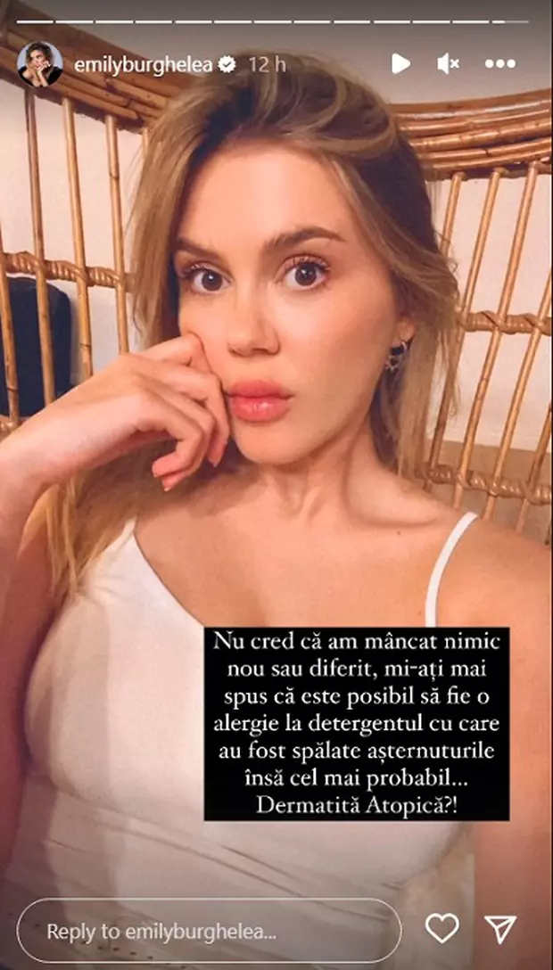 'Nu cred că am mâncat nimic nou sau diferit, mi-ați mai spus că este posibil să fie o alergie la detergentul cu care au fost spălate așternuturile, însă, cel mai probabil, dermatită atopică', a adăugat fosta concurentă de la 'Bravo, ai stil'.