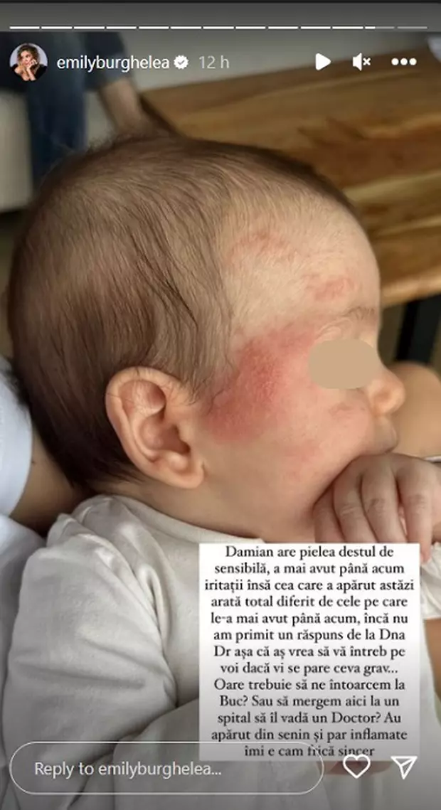 Dar au fost și momente mai puțin plăcute pentru Emily Burghela, când fiul lor, micuțul Damian a făcut o iritație pe piele, în zona capului. Îngrijorată de ce i se întâmplă copilului, Emily a cerut ajutorul internauților, întrebându-i într-o sesiune de Insta Stories dacă ei au trecut vreodată prin așa ceva și cum au gestionat problema.