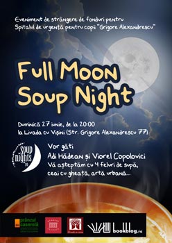 Duminica, 27 iunie, Soup Nights Romania alaturi de asociatia Invictus va invita la „Full Moon Soup Night', un eveniment de strangere de fonduri pentru dotarea cu aparatura moderna a compartimentului de terapie intensiva pentru nou-nascuti de la Spitalul de Urgenta pentru Copii „Grigore Alexandrescu' din Bucuresti.