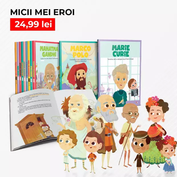 „Micii Mei Eroi” de la Libertatea. Ajută-l să descopere eroi în carne și oase, oameni care au realizat lucruri mărețe și care au schimbat lumea în care trăim, cum ar fi Leonardo da Vinci, Albert Einstein, Marco Polo, Marie Curie, Amadeus Mozart etc. Oferă-i plăcerea de a citi poveștile lor, într-o colecție de cărți copii ilustrate create special pentru cei mici.