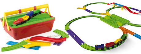 Setul Trenino Toolbox contine 6 tipuri diferite de sine si o cutie de transport sau depozitare. Fiecare sina are o culoare diferita, astfel incat copiii pot reproduce cu usurinta exemplele de pe cutie, invatand totodata sa deosebeasca culorile. In plus, folosind capacul cutiei ei pot construi o platforma unde se pot modifica directiile de mers, schimband astfel traseul trenuletului. Rezultatul e o cale ferata colorata, de-a lungul careia cei mici pot conduce trenul, care traverseaza poduri, asi poate schimba directia, ajungand oriunde e condus de fantezia celui mic.