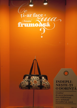 In cadrul campaniei, vitrinele sucursalelor ING au fost decorate cu diverse obiecte de la pantofi si genti, la produse de design interior si telefoane mobile.