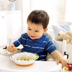 Exista si solutia de compromis – in afara linguritei de baza, puteti „inarma bebelusul cu propria lui lingurita. Nu va reusi din prima sa duca mancarea la gurita, dar macar va putea reda miscarea pe care o faceti voi, iar prin repetitie va ajunge la performanta de a atinge gura.