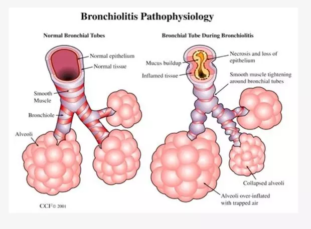 Se observă foarte clar diferența între căile aeriene normale (în stânga imaginii) și cele din bronșiolită.