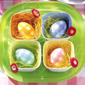 Asaza castronasele pe tava, in interiorul lor pune firele textile, apoi aranjeaza ouale (doar dupa ce s-a uscat vopseaua) si pune cate o floare in fiecare castronas.