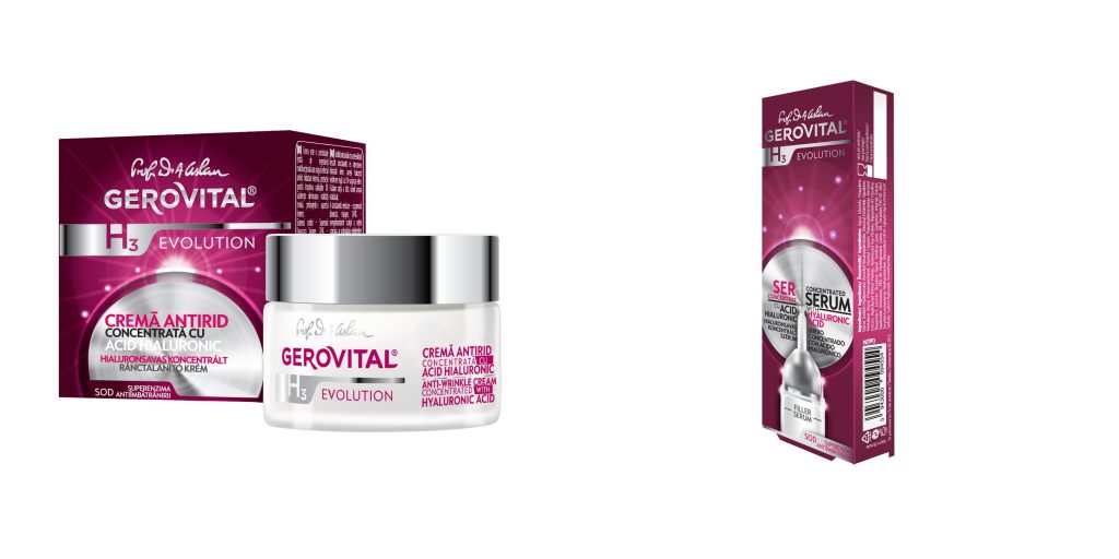 Crema antirid intens hidratantă Gerovital H3 Evolution are o formulă inovatoare cu acid hialuronic pur şi lipozomal, redând vitalitatea tenului și prelungindu-i aspectul tineresc, în timp ce pentru o îngrijire specială şi hidratare intensă, specialiştii Gerovital recomandă Serul cu Acid Hialuronic, concentrație 6%. Acesta este bogat în Acid hialuronic pur, lipozomal 6% şi vitamina C lipozomală, cu puternice efecte antiage, de umplere și netezire a ridurilor.