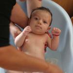 Tine-i capul aplecat spre spate pentru a evita sa-i ajunga in ochi apa sau sampon (chiar daca este din cel special, „fara lacrimi). Acest fapt il poate agita si sa-l faca pe micut sa nu suporte baia.