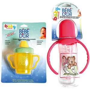 Produsele pentru nou-nascuti, sugari si copii mici, de la Bébé DOr: biberoane, suzete, pahare speciale pentru bebelusii care invata sa bea singuri, prevazute cu mânere si cu o parte moale, dintr-un cauciuc special, pentru a nu rani gingiile copilului.