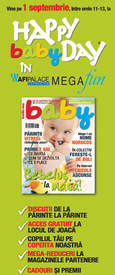 Te asteptam miercuri, 1 septembrie, incepand cu ora 11, la HAPPY baby DAY, in Afi Palace Cotroceni Mega Fun, zona centrala, langa patinoar!
