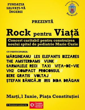 Mihai Margineanu, Les Elephants Bizarres, Vunk, Sarmalele Reci, Taxi, Vita-de-Vie, VH2, Compact, Proconsul, Bere Gratis, Voltaj, Stefan Banica Jr., Iris, Dida Dragan si Corul Allegretto canta in cadrul concertului „Rock pentru Viata', pentru a sprijini initiativa Fundatiei „Salvati-va Ingerii', de strangere de fonduri, destinata construirii noului spital de pediatrie Marie Curie.