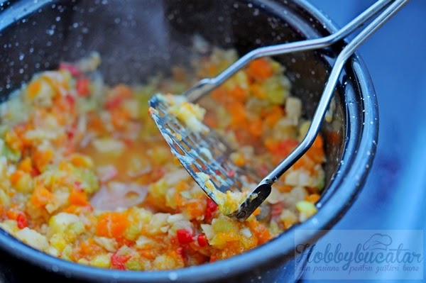 Pana fierbe meiul, pasam legumele. Fiecare dupa puteri: daca ai robot, foare bine, intr-un minut ai terminat si obtii pasta pentru supa-crema. Eu ma descurc cu pasatorul cu care fac piure, pentru ca, nah, sunt un blogger culinar care se „respecta”: adica nu am de niciunele in afara de pasiune si un obiectiv foto bun. Probabil trebuia sa-mi numesc blogul „cum faci de mancare cand ai doar cateva farfurii si trei usensile ieftine”… Dar mai bine sa tac si sa revin la ce pui in farfurie. Avantajul pasatorului: mancarea ramane mai texturata si… da bine!