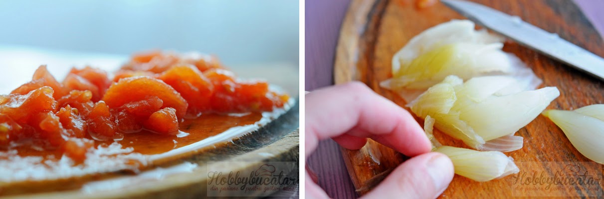 Scoate rosia din apa, lasa-o sa se racoreasca, apoi curata-i pielita si taie cuburi pulpa de rosie oparita. Ia cu ocazia asta si ceapa fierta din oala si taie-o si pe ea maruntel. Uite cam asa.