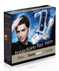 Noul set de cosmetice' Freedom for Him' contine samponul CLEAR Men Hair Fall Decrease special creat pentru scalpul barbatilor, un sapun Dove cu 1/4 crema hidratanta ce curata si ingrijeste delicat pielea.